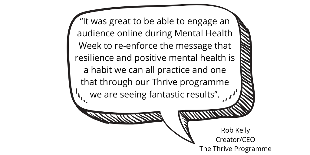 We are also proud to host Rob Kelly CEO of the THRIVE programme – a mental health training programme that teaches people the skills and resources to overcome mental health issues and learn to thrive. Included in the training is a designated programme titled ‘THRIVE in Business’, which details how to optimise and reinvigorate a team’s performance, resilience and wellbeing by utilising methods specifically tailored to extract the benefits of connecting with and maintaining the natural world and community spirit.